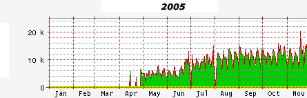 From where I sit. (By MBGJ Dec./2005) Fast start and sustained growth on the net - myth or reality? Please read the short article below and judge for yourself. In January 2005 I was approached by a client - "Could I help launch a site, get it noticed and more important stay there and grow". After checking the business sector and competition my answer came in form of two questions. Can you deliver 100 pages of high grade content in 4 weeks? Can you deliver at least 5 new pages per day for at least 6 month? After further intensive research a budget was agreed. Names reserved, technical groundwork put in. The site launched on the 10th of April and was immediately interlinked with our existing network. Below shows the HTML traffic pattern.